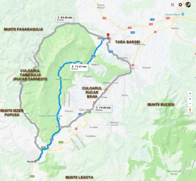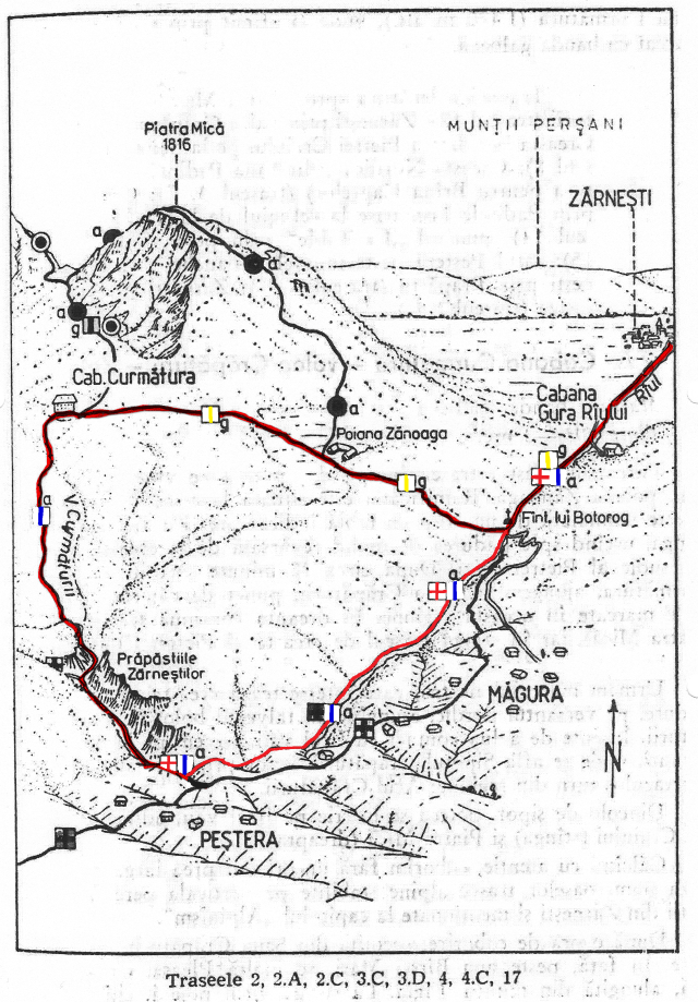 P.S. Recomand pentru studiul masivului Piatra Craiului atat din punct de vedere al turismului cat si al apinismului „Piatra Craiului, Turism Alpinism, Em. Cristea, 1971 (harta traseu preluata si modificata).
