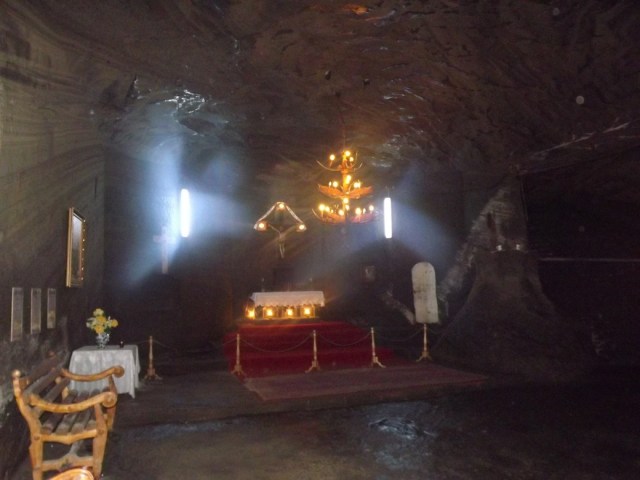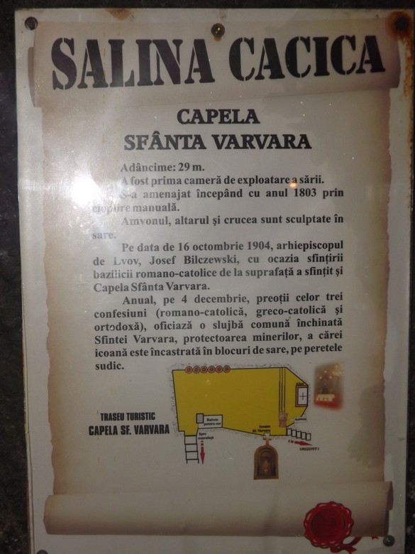Coborand treptele ajungem la o mica biserica sapata in sare situata la adancimea de 27 m. Aceasta biserica se remarca prin faptul ca pe 4 decembrie de ziua Sintei Varvara, se oficieaza slujba de catre cele 3 culte din localitate : cultul ortodox, romano catolic si greco catolic, astfel ca putem spune ca aici la Cacica ecumenismul este la putere.