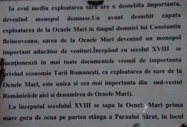 Zacamantul de sare gema de la Ocnele Mari are o lungime de 7,5 km pe directia V-E si o latime de 3 km pe directia N-S. Exploatarea sarii la Ocnele Mari s-a facut inca din neolitic. De-alungul paraului Sarat care trece pe langa salina, dacii construisera un intreg sistem de asezari si fortificatii care aparau celebra cetate Buridava (care dupa spusele istoricilor ar fi fost asezata pe teritoriul Ocnelor Mari). Exploatrea sarii a continuat si in timpul stapanirii romane. In Evul Mediu sarea avea sa devina monopol domnesc iar mina de la Ocnele Mari devine cea mai importanta exploatare din S-V Romaniei. Continuarea prezentarii in pozele de mai jos :