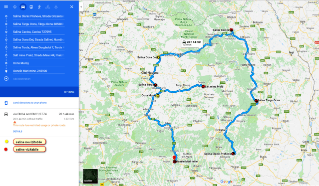 Traseul nostru porneste de la Salina Slanic Prahova, salina situata in judetul meu natal, judetul Prahova. Mai jos le vom descrie pe fiecare, desi unele dintre ele le-am prezentat fragmentat si in alte articole. Odata cu redactarea acestui articol voi incorpora si alte articole mai vechi (care ulterior vor fi sterse) si voi completa cu ceea ce nu am descris pana acum pe acest blog.