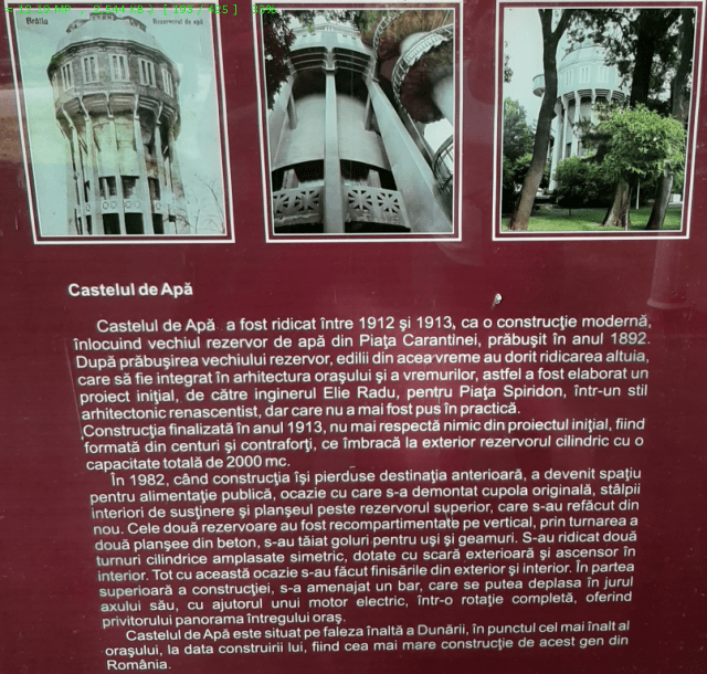 Un loc de unde s-ar putea admira orașul în toată splendoarea sa este CASTELUL DE APĂ din mijlocul Gradinii Mari sau Gradinii Publice. Acest Castel de Apa  a fost ridicat între anii 1912-1913 și este format din centuri și contraforți ce îmbracă la exterior rezervorul cilindric de 200 mc. Privindu-l de departe forma sa originală seamănă cu un cabestan – (folosit pe vapoare pentru virarea ancorei la bord). Înalt de aproape 40 de m, turnul inițial a fost folosit noaptea ca far pentru corăbiile ce veneau pe Dunăre, iar ziua ca punct de belvedere.